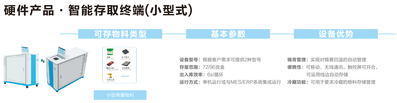 小型一對一智能存取終端,可實(shí)現(xiàn)對錫膏回溫的自動管理,可移動,無線通訊、觸控屏可開會,可運(yùn)用線邊自動存儲??捎糜谝罄洳氐奈锪洗鎯芾?。