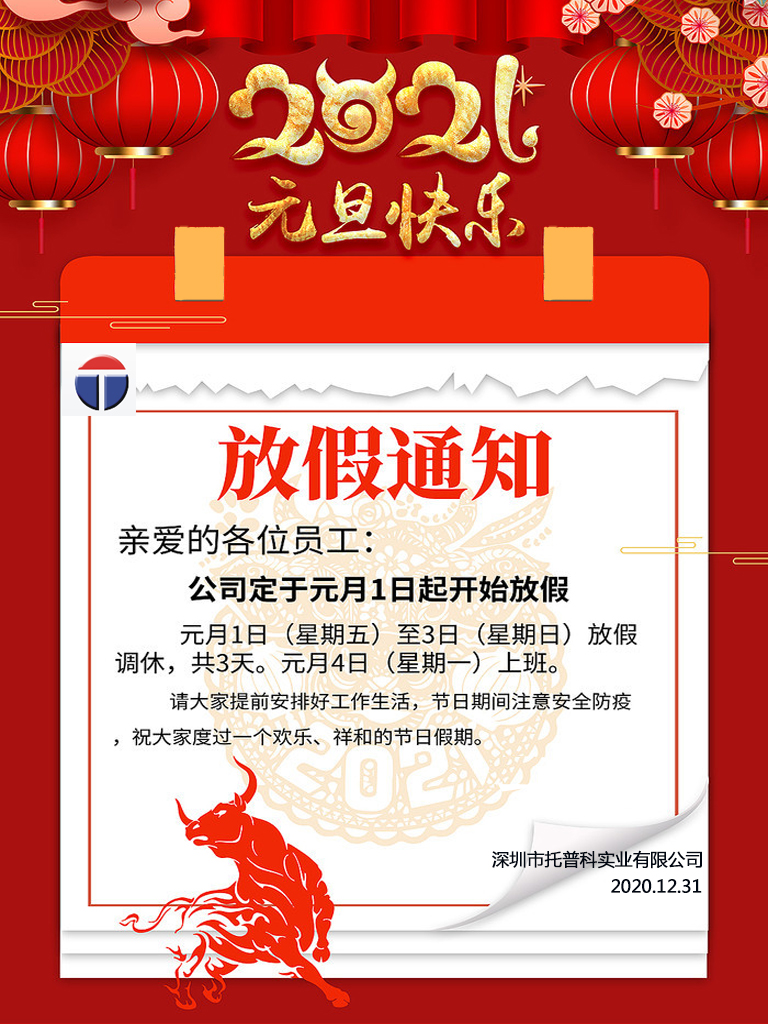 深圳托普科實(shí)業(yè)有限公司2021年元旦放假通知