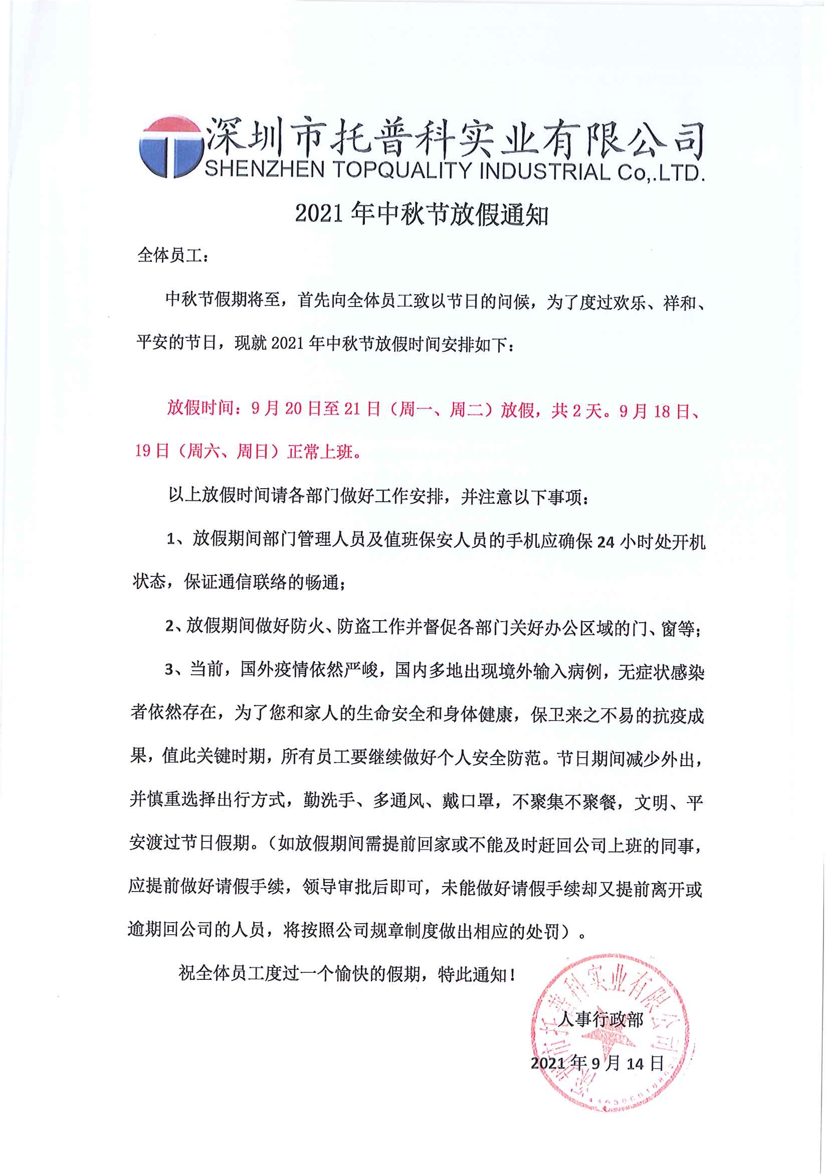 放假時(shí)間:2021.9.20-9.21 放假兩天,詳情如下圖所示