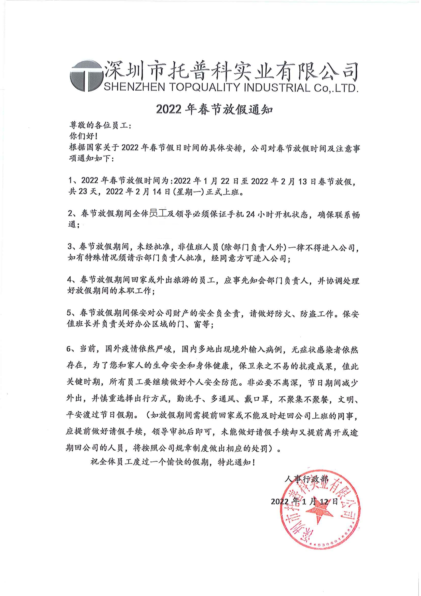 深圳市托普科實業(yè)2022年春節(jié)放假通知