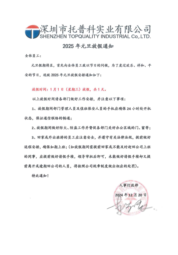 感謝大家一直以來對我們公司的支持與信任,在此,公司全體員工向您致以最誠摯的新年祝福,愿您在新的一年里身體健康、工作順利、闔家幸福、萬事如意!