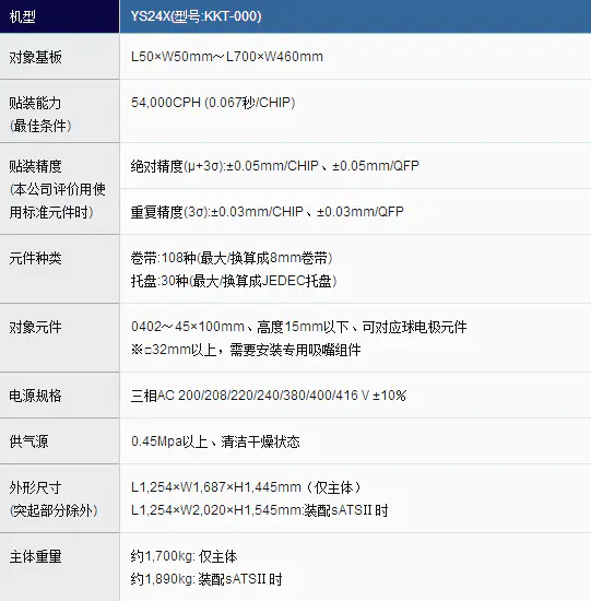 YAMAHA貼片機-YS24X型產品概述: 54,000CPH(0.067 秒/CHIP)通用貼片機最佳的貼裝能力 sATSⅡ自動交換式托盤 對應供給裝置 L700×W460mm 對應超大型基板 對應雅馬哈雙搬運軌道系統 0402~45×100mm 對應元件 H15mm 對應高度