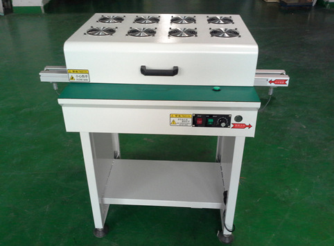 aoi位于smt生產(chǎn)線的后段,是通過(guò)接駁臺(tái)連接回流焊,因經(jīng)過(guò)回流焊高溫焊接(通常會(huì)達(dá)到220攝氏度),而在經(jīng)過(guò)冷卻區(qū)后,某些pcba板子的余溫還是比較高,因?yàn)樵诨亓骱负竺妫碼oi前)加冷卻接駁臺(tái),冷卻接駁臺(tái)顧名思義就是起到冷卻的作用,目的是為了加快剛焊接出來(lái)的pcba板降溫,相對(duì)于普通的接駁臺(tái),就是在接駁臺(tái)上方加了許多的風(fēng)扇,使pcba通過(guò)接駁臺(tái)的時(shí)候可以更快降溫。冷卻接駁臺(tái)如下圖所示